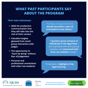 The law student series Effective Communication Across Differences (“ECAD”). This hands on four-part series will transform your law school experience, and your career and professional relationships, where the ability to communicate productively across differences is essential. Led by experienced mediators and with small group interaction with Federal Judges, this program for rising 1-3Ls attending 9th Circuit law schools is not to be missed.